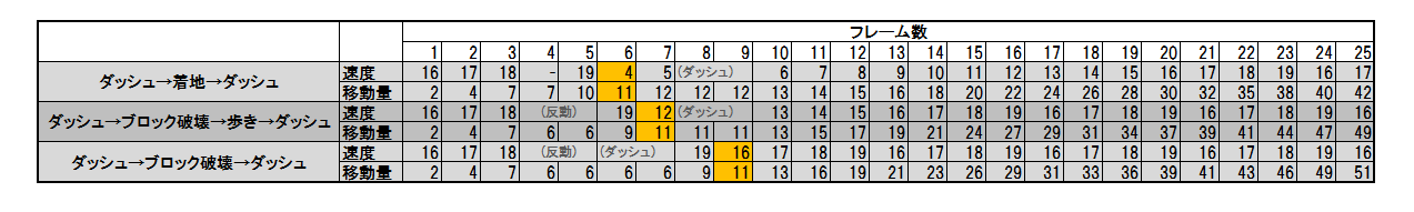 上表からワリオが速度15に達してから28フレーム後には通常ダッシュの方が早くなる。